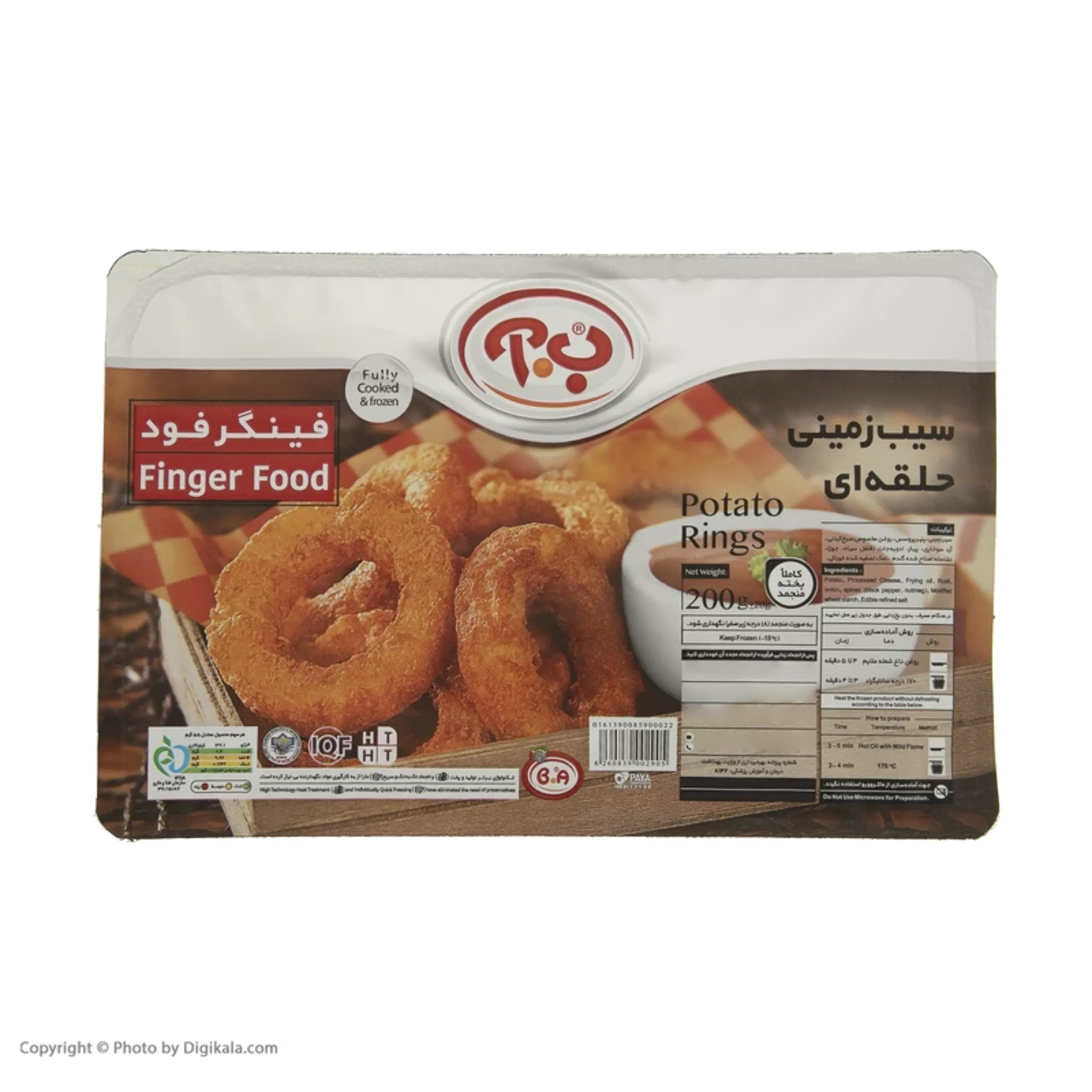 - ارزش غذایی هر سهم سیب زمینی حلقه ای معادل 55 گرم : - انرژی : 179.85 کیلو کالری - قند : 0.1 گرم - چربی : 12.65 گرم - نمک : 0.55 گرم - اسید های چرب ترانس : 0.01 گرم